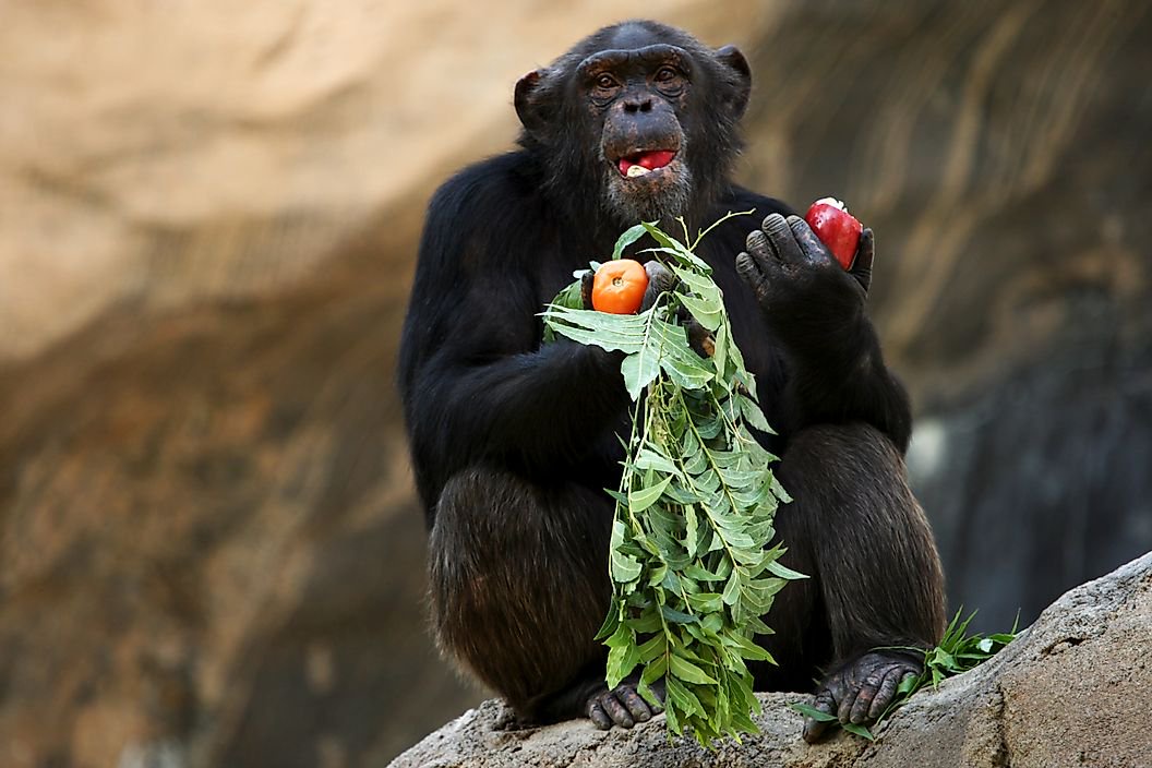 A great ape species, the chimpanzee is an omnivore. It occurs in the forests and savannah of tropical Africa, where it lives in large groups of 15 to 150 members. While fruits are most preferred, chimps also eat other plant parts like leaves, stems, bark, resin, etc. They also supplement their diet with eggs, birds, insects, etc., and even hunt larger prey like red colobus monkeys, infant/juvenile bushbucks, warthogs, baboons, etc. However, animal parts make up only a small portion of the diet of these apes, with females consuming much lesser animal flesh than males.