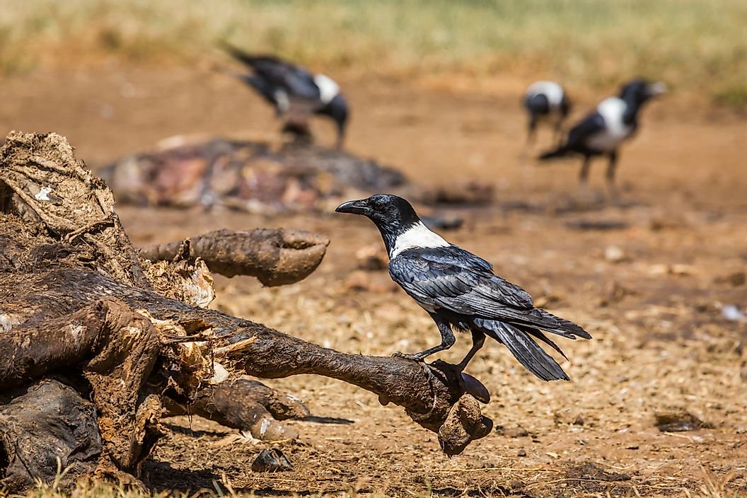 Like all crow species, the pied crow is also an omnivore. This species has a wide distribution in Africa. It often occurs in or near human-dominated landscapes. Pied crows live in pairs or small groups but gather in large numbers in areas with sufficient food availability. Its varied diet includes both plant matter and animals, ranging from insects to rodents and even fruit bats. These birds also feed on carrion and scraps in garbage dumps.